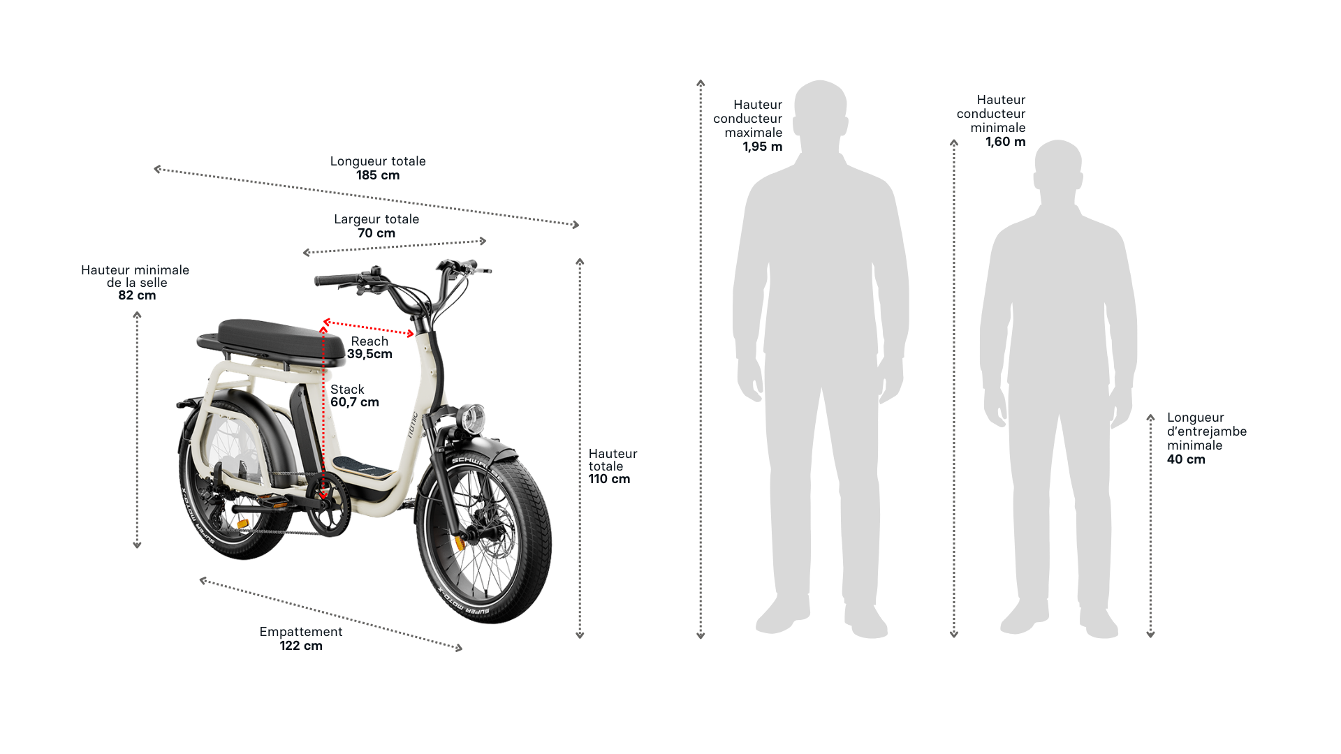 Selle basse (d'origine) adaptée à des utilisateurs de 1,60 m à 1,85 m. et selle haute (en accessoire), adaptée à des utilisateurs de 1,70 m à 1,95 m.